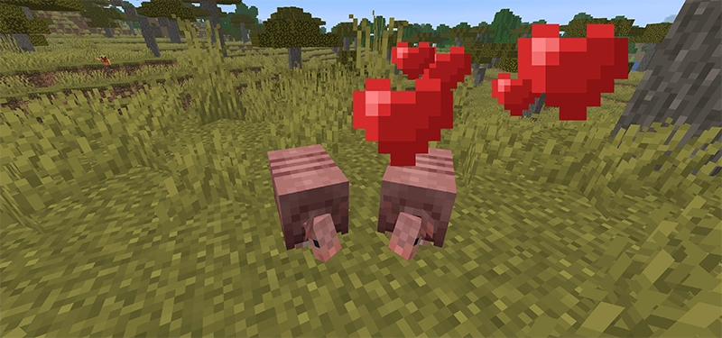 | まずはアルマジロを2匹見つけましょう。スポーン場所の詳細と見つけ方は上記で解説しています。 | 両方のアルマジロにクモの目を与えましょう。ハートマークがでていればOKです。 | ハートマークが出た後、2匹が近づいて子供が生まれたら完了です。 |
