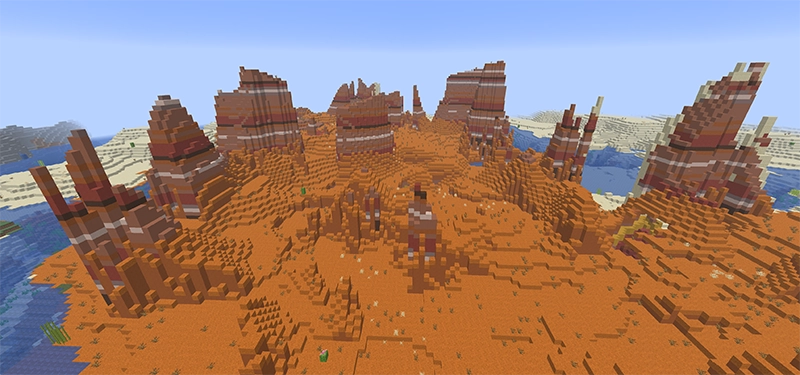 1~2匹の群れでスポーン。砂漠の 砂が 赤い砂に置き変わった赤い見た目で、廃坑が剥き出しになっていることがあります。 | 1~2匹の群れでスポーン。メサの丘の頂上付近にオークの木が生えており、丘の地表はメサでは珍しく 草ブロック・ 粗い土となっています。 | 1~2匹の群れでスポーン。テラコッタでできた細長い塔のようなものが生成されています。 |