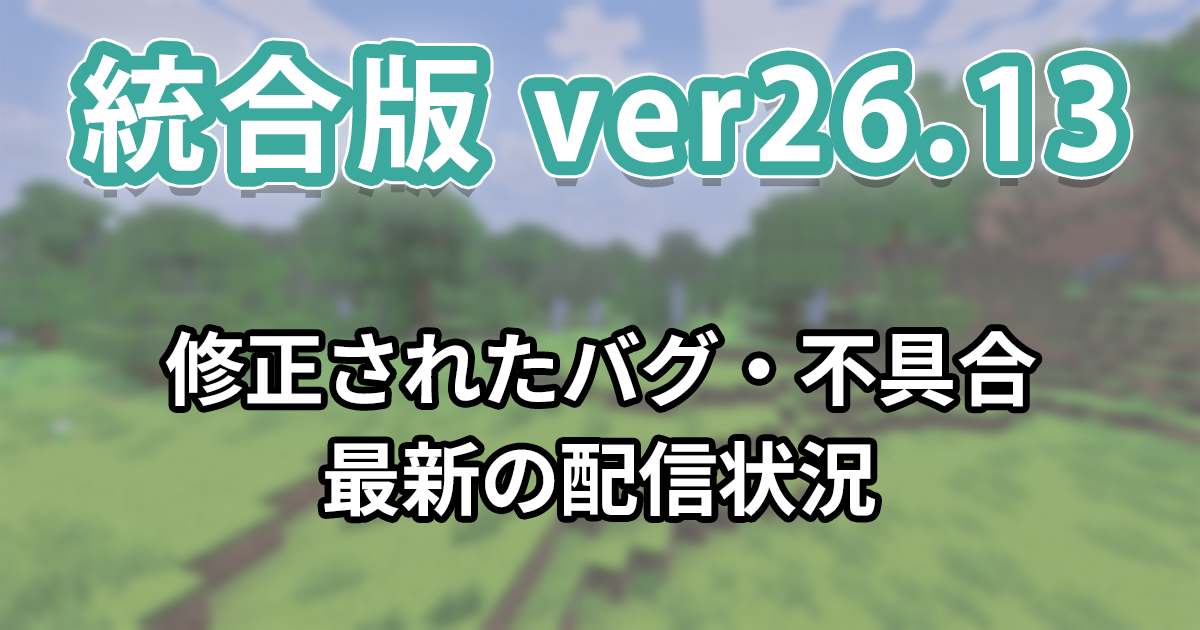 マイクラ統合版の最新バージョン「ver26.13(1.26.13)」が配信されました。前に配信されたver26.10(Xへ)、ver26.11、ver26.12で発生していたバグ/不具合の修正アップデートになります。