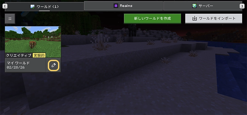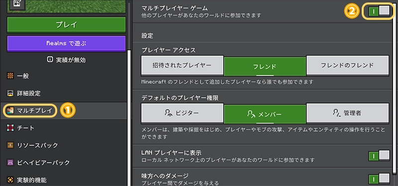 | マルチプレイで遊びたいワールドの編集ボタン(鉛筆のマーク)を選択しましょう。 | 左欄のマルチプレイを選択し、「招待されたプレイヤー」から、「フレンド」または「フレンドのフレンド」に変更しましょう。 |