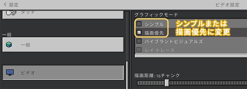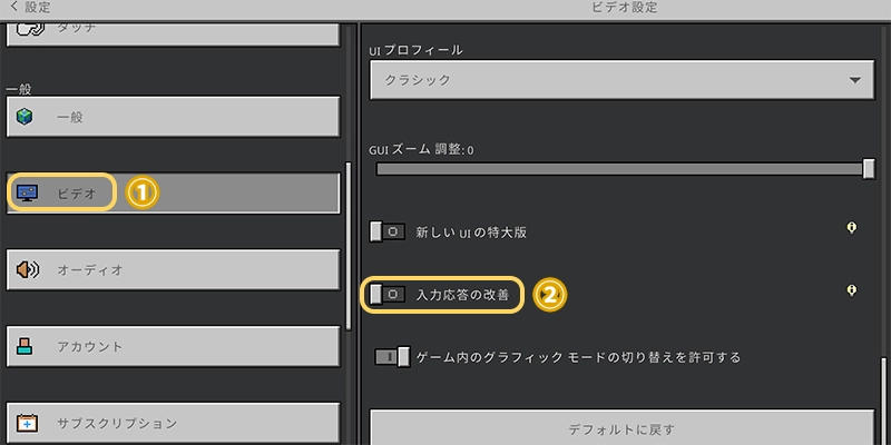 タイトル画面から設定を開きましょう。左欄をスクロールして「ビデオ」を開き、その中の「入力応答の改善」を無効()にしましょう。無効にしたら、必ずマイクラを再起動しましょう。設定が反映されない場合があります。