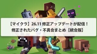 アップデート 【マイクラ】26.11 修正アップデートが配信!修正されたバグ・不具合まとめ【統合版】 マイクラ統合版の最新バージョン「ver26.11(1.26.11)」が配信されました。前に配信されたver26.10(Xへ)で発生していたバグ/不具合... 2026.03.27 アップデート